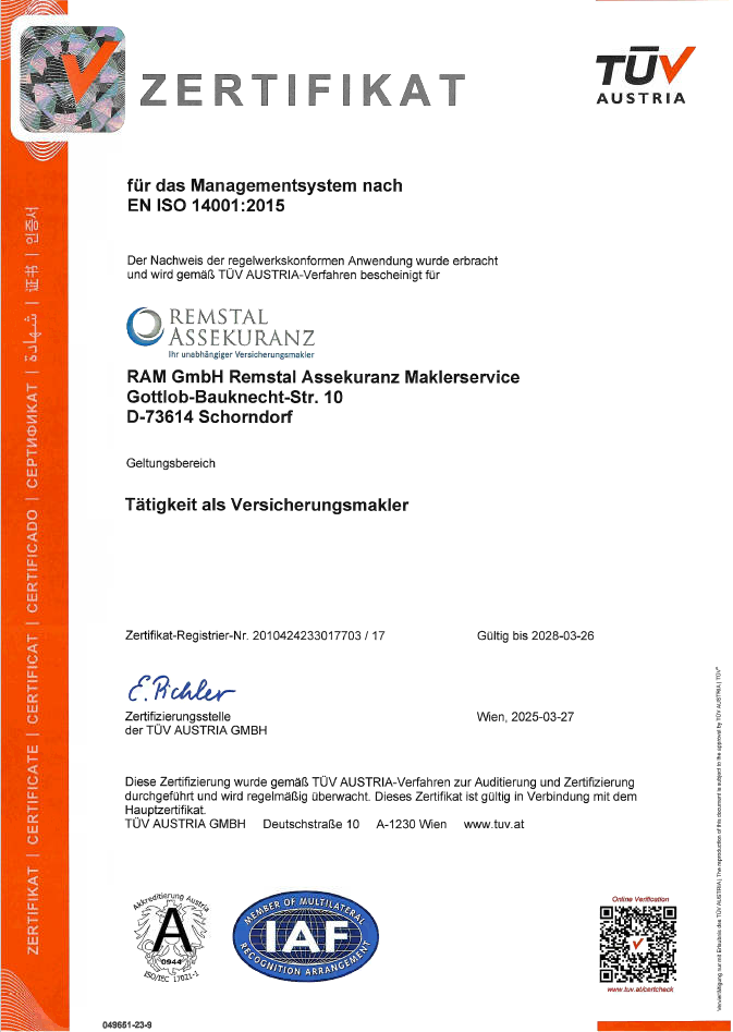Für unser Umweltmanagement und nachhaltiges Engagement haben wir im Januar 2023 die ISO 14001 Zertifizierung als einer der ersten Versicherungsmakler in Süddeutschland erhalten.